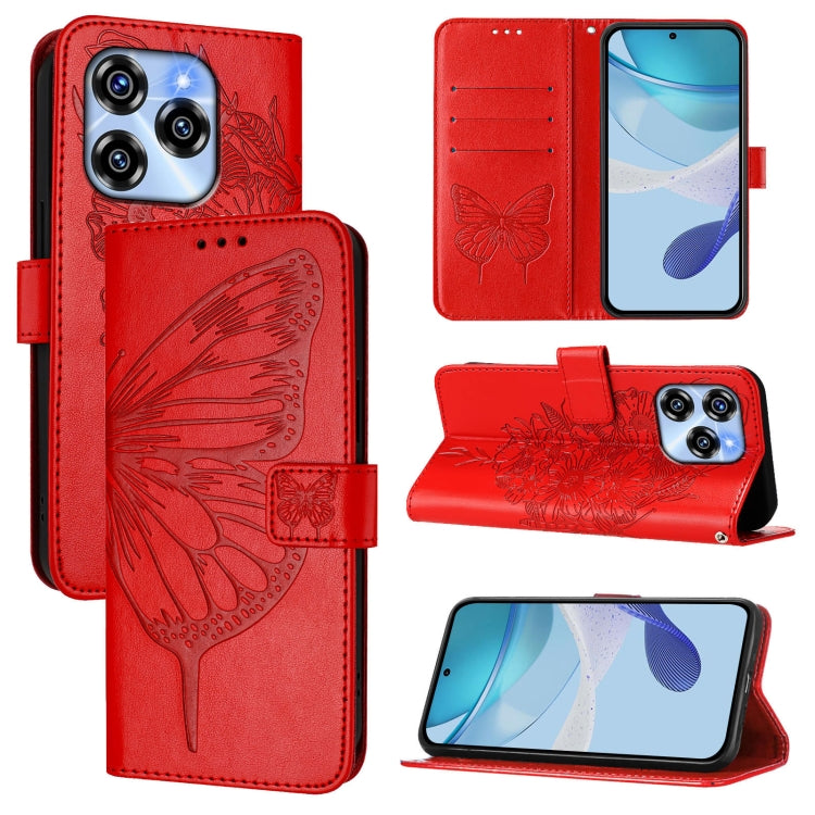 Funda de Cuero para Oukitel C50 con Diseño de Mariposa en Relieve (Roja)