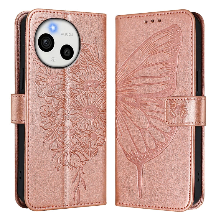 Funda de Cuero para Sharp Aquos Sense9 Plus con Diseño de Mariposa en Relieve (Oro Rosa)