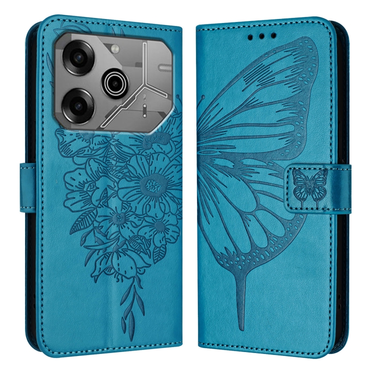Funda de Cuero para Tecno Pova 6 Neo con Diseño de Mariposa en Relieve (Azul)