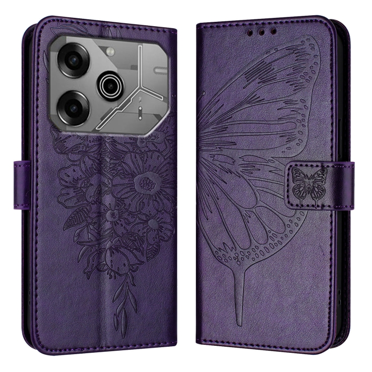 Funda de Cuero para Tecno Pova 6 Neo con Diseño de Mariposa en Relieve (Morado Oscuro)