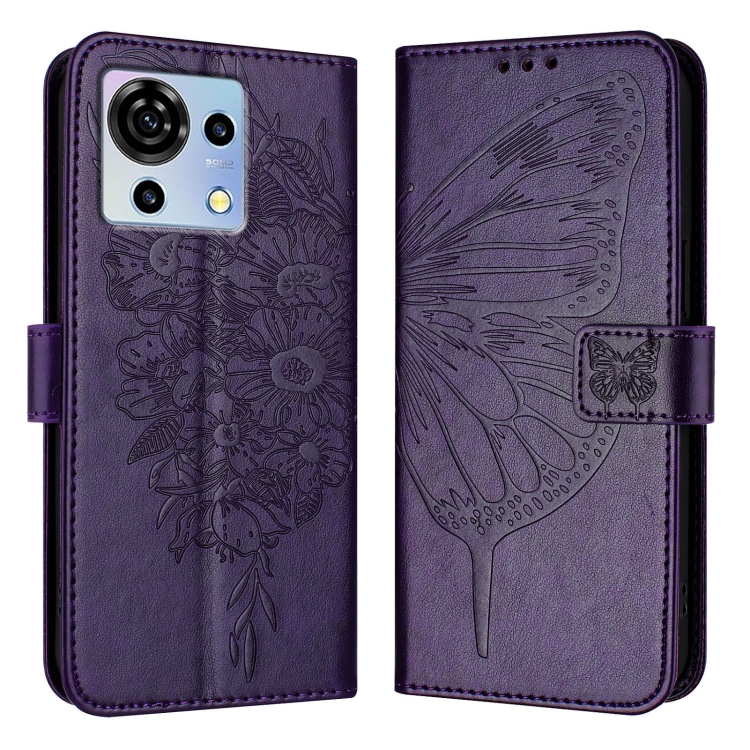 Funda de Cuero para ZTE Blade V50 Vita con Diseño de Mariposa en Relieve (Morado Oscuro)