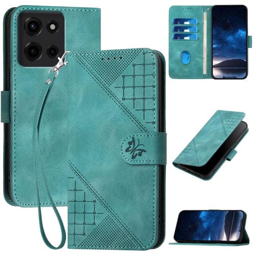 Funda de Cuero Motorola Moto G 2025 con Diseño Mariposa En Relieve y Cordón (Azul Claro)