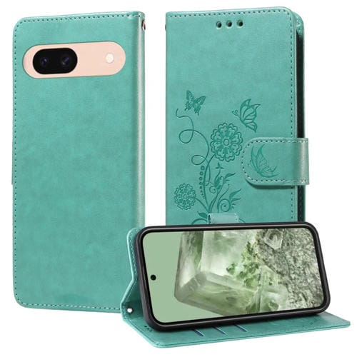 Funda de Cuero para Google Pixel 8A con Diseño de Mariposas y Flores en Relieve (Verde)
