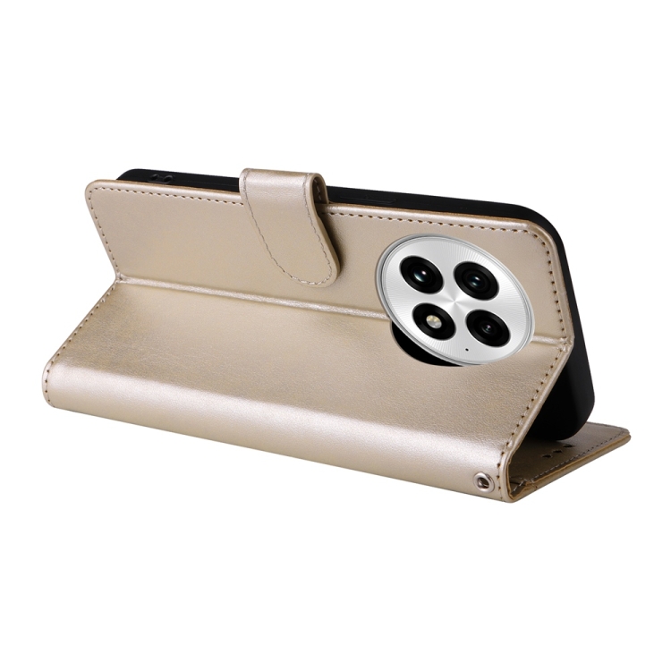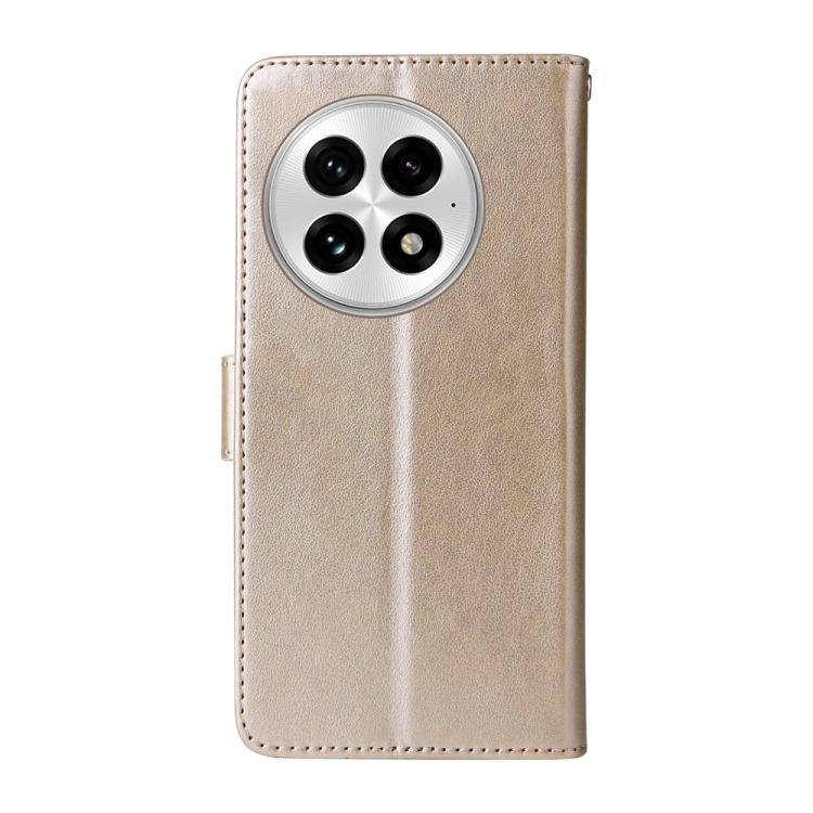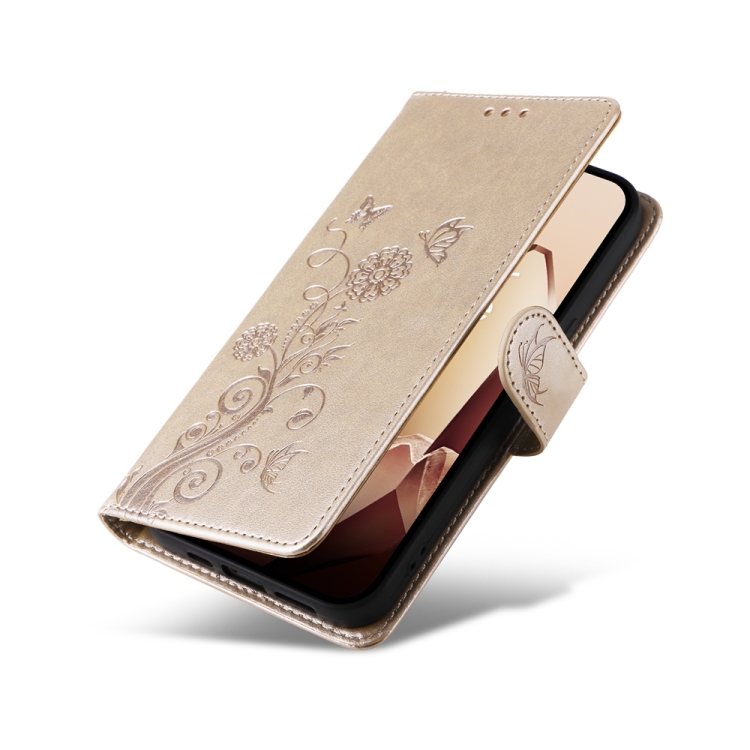 Funda de Cuero OnePlus 13 con Diseño de Mariposas y Flores en Relieve (Dorada)