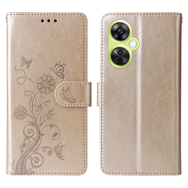 Funda de Cuero OnePlus Nord Ce 3 Lite/Nord N30 con Diseño Mariposas y Flores en Relieve (Dorada)