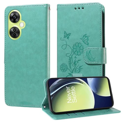 Funda de Cuero para OnePlus Nord Ce 3 Lite y Nord N30 con Diseño de Mariposas y Flores en Relieve (Verde)