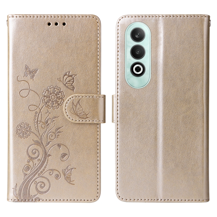 Funda de Cuero OnePlus Nord Ce 4 5G con Diseño Mariposas y Flores en Relieve (Dorada)