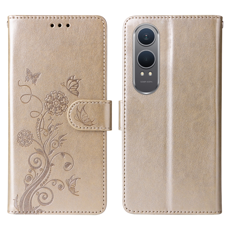 Funda de Cuero para OnePlus Nord Ce 4 Lite con Diseño de Mariposas y Flores en Relieve (Dorada)