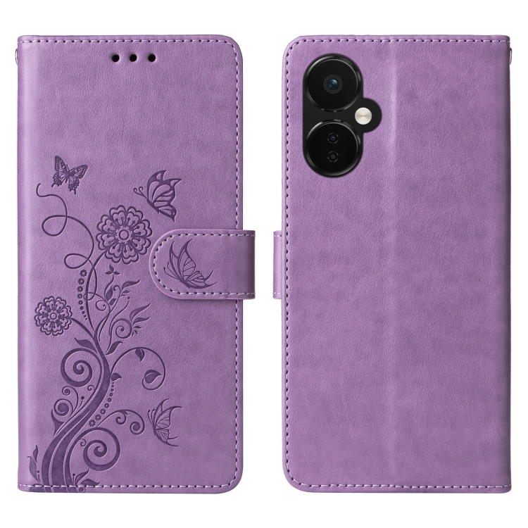 Funda de Cuero para OnePlus Nord Ce3 con Diseño de Mariposas y Flores en Relieve (Morado)