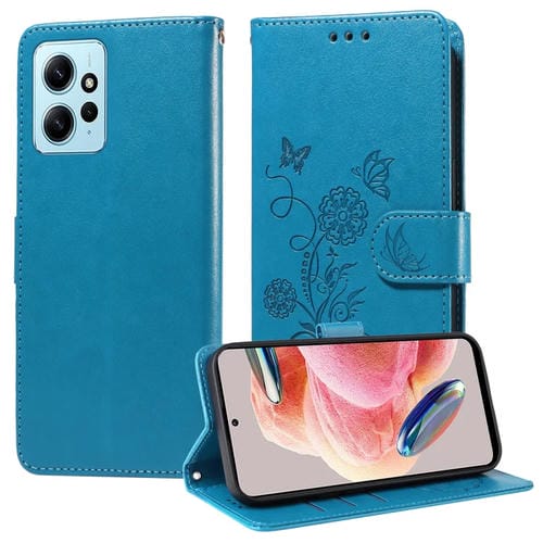 Funda de Cuero con Diseño de Mariposas y Flores En Relieve para Redmi Note 12 4G (Azul)