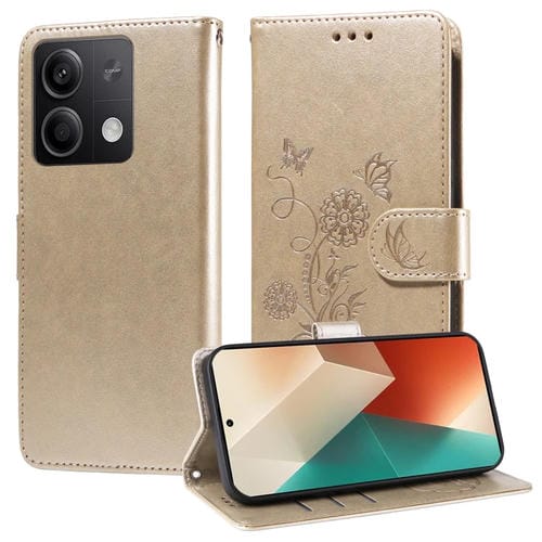 Funda de Cuero con Diseño de Mariposas y Flores En Relieve para Redmi Note 13 5G (Dorada)
