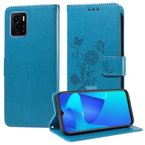 Funda de Cuero con Diseño de Mariposas y Flores En Relieve para Vivo Y15A 4G Global / Y15S 4G (Azul)