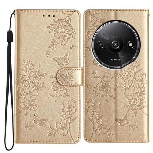 Funda de Cuero con Diseño de Mariposas y Flores para Redmi A3 (Dorada)