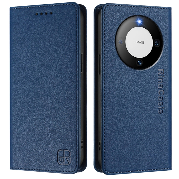 Funda de Cuero con Doble Pliegue y Succión Magnética RFID para Huawei Mate 60 Rc01 (Azul Oscuro)