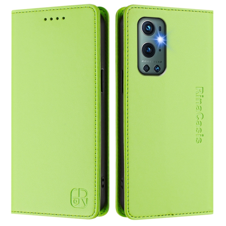 Funda de Cuero con Doble Pliegue y Succión Magnética RFID para OnePlus 9 Pro Rc01 (Verde Hierba)