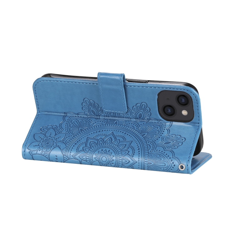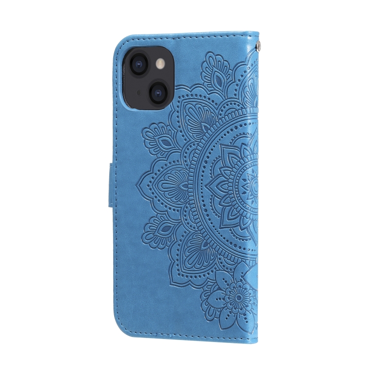 Funda de Cuero para iPhone 14 Estampado Flores 7 Pétalos (Azul)
