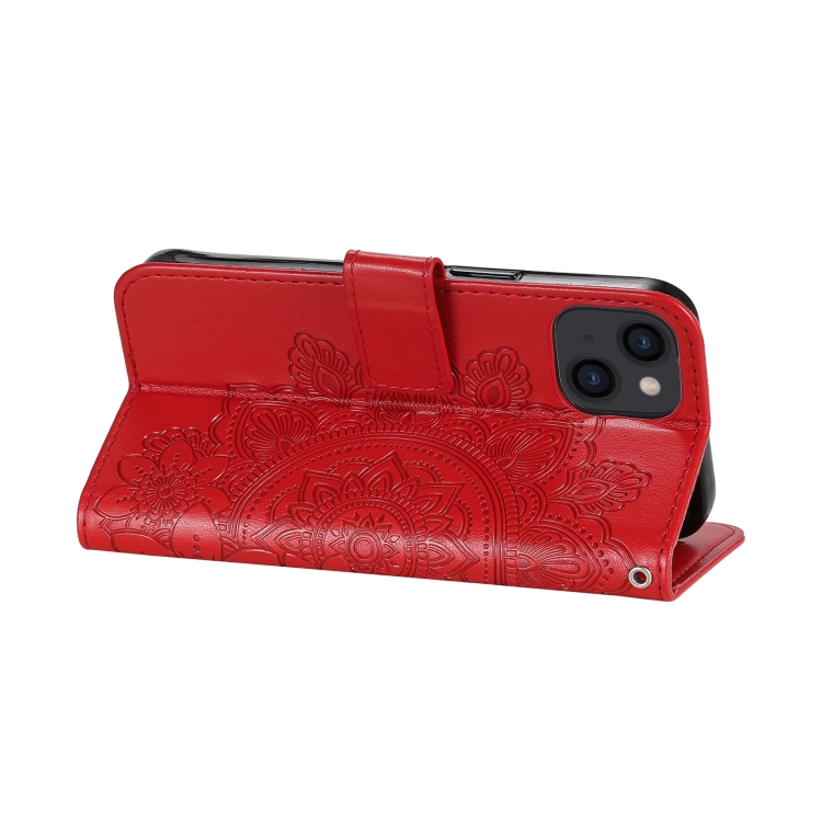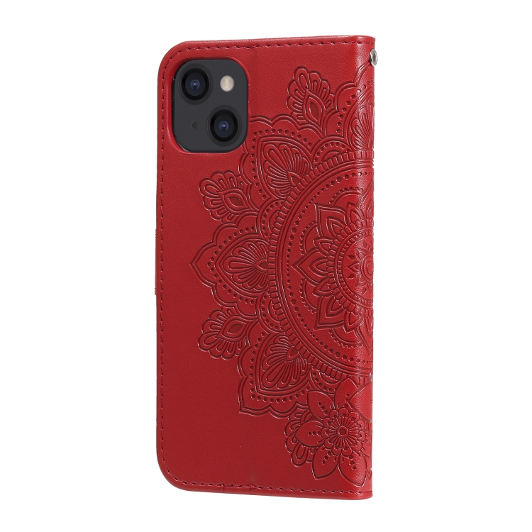 Funda de Cuero iPhone 14 Estampado Flores 7 Pétalos (Rojo)