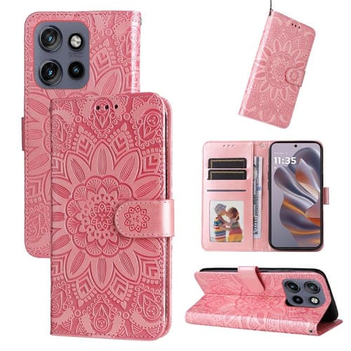 Funda de Cuero con Estampado de Girasoles en Relieve para Motorola Edge 50 Neo/Thinkphone 25 (Oro Rosa)