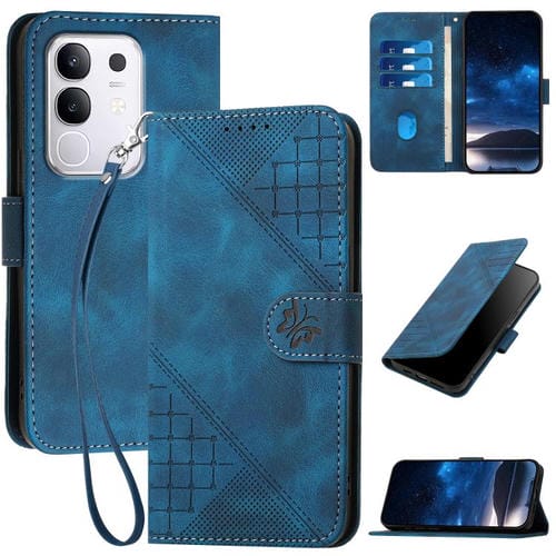 Funda de Cuero con Estampado de Mariposas En Relieve y Cordón para Vivo Y29 4G (Azul Oscuro)