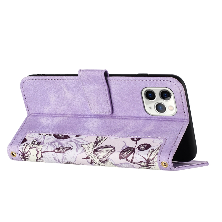 Funda de Cuero iPhone 12/12 Pro Estampado Floral con Cordón (Morado Claro)