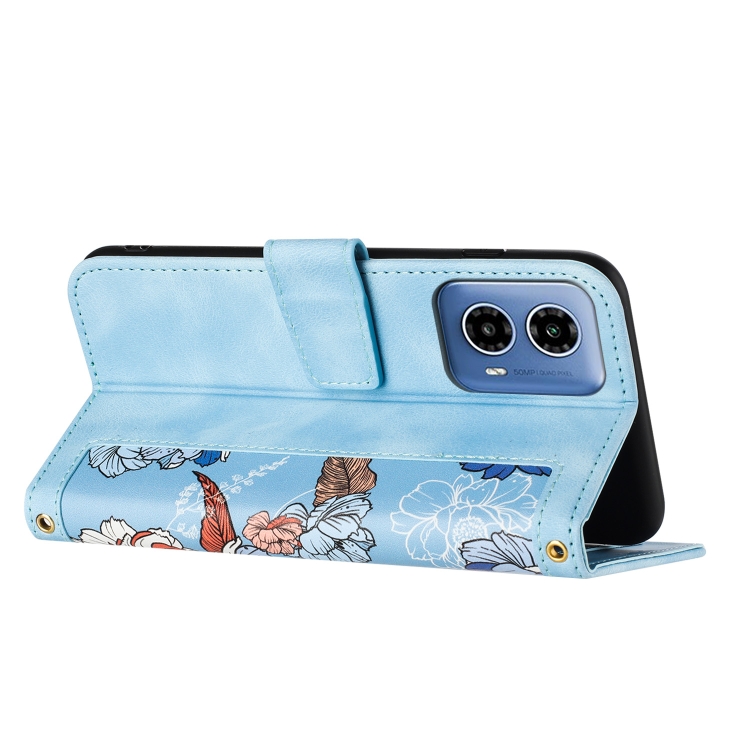 Funda de Cuero con Estampado Floral para Motorola Moto G 5G (2024) con Cordón (Azul Claro)