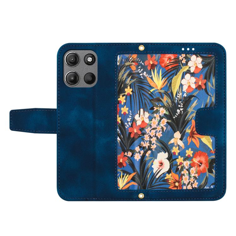 Funda de Cuero con Estampado Floral para Motorola Moto G15 con Cordón (Azul Oscuro)