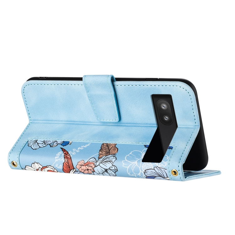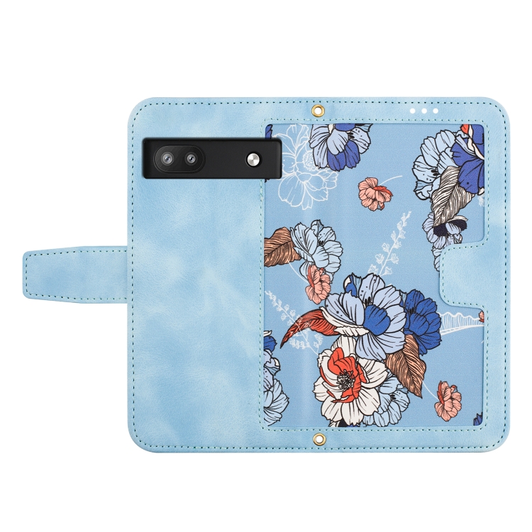 Funda de Cuero con Estampado Floral para Google Pixel 6A con Cordón (Azul Claro)