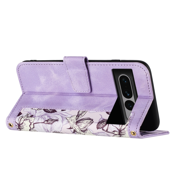 Funda de Cuero con Estampado Floral para Google Pixel 7 Pro con Cordón (Morado Claro)