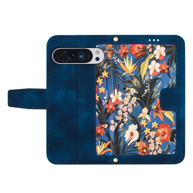 Funda de Cuero con Estampado Floral para Google Pixel 9 Pro XL con Cordón (Azul Oscuro)