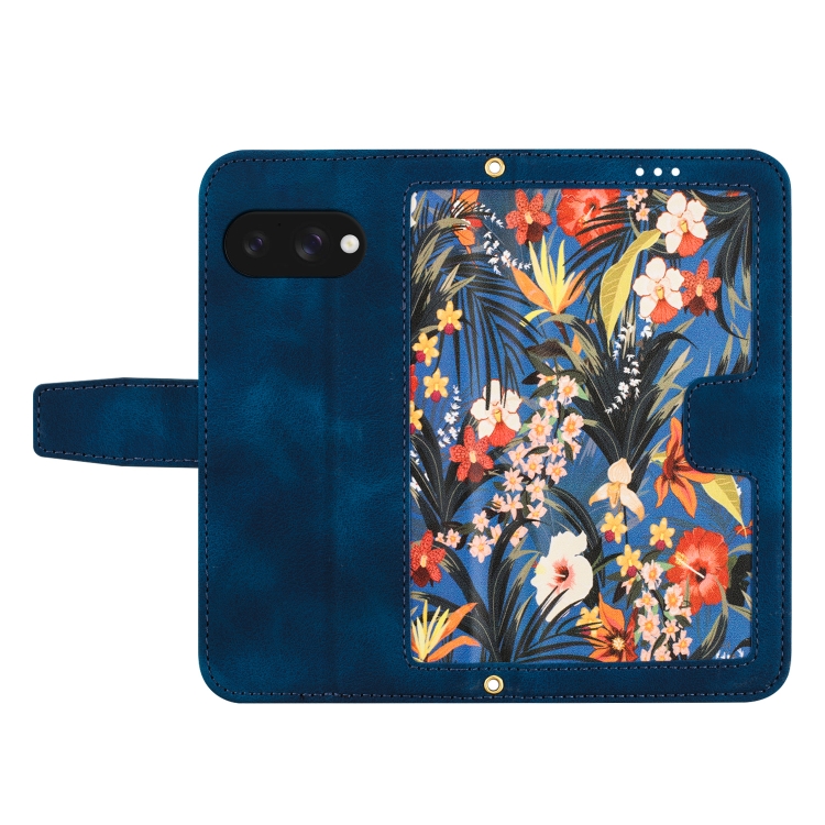 Funda de Cuero con Estampado Floral para Google Pixel 9A con Cordón (Azul Oscuro)