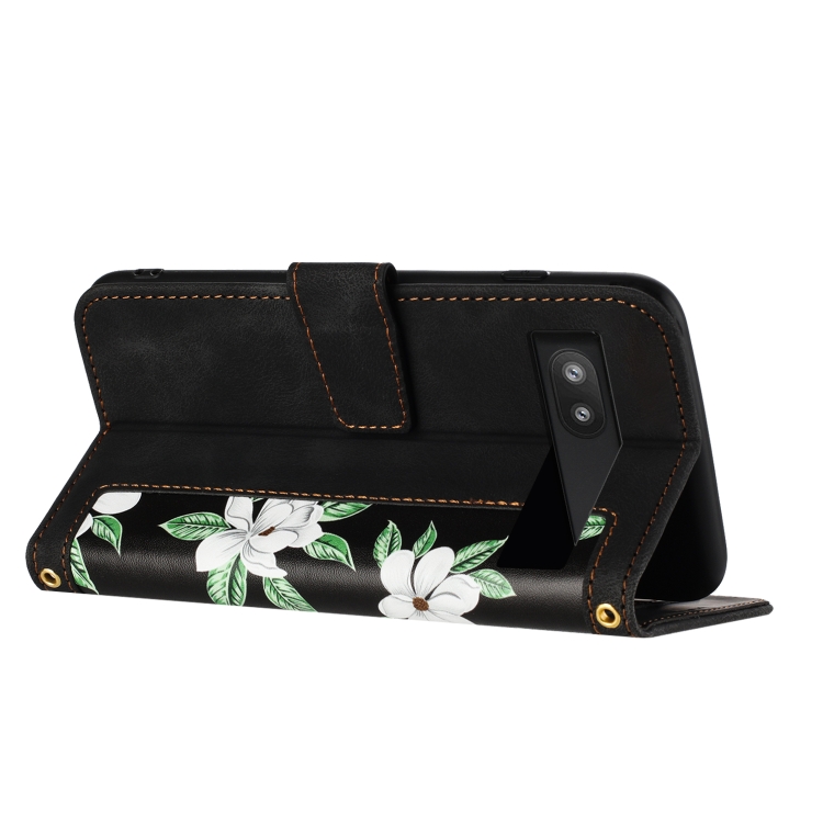 Funda de Cuero con Estampado Floral y Cordón para Google Pixel 6A (Negro)