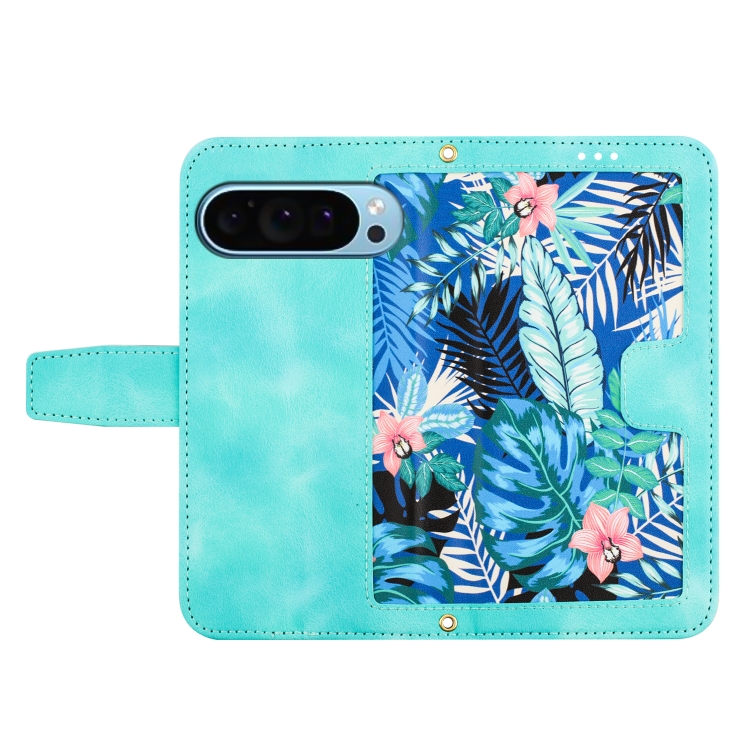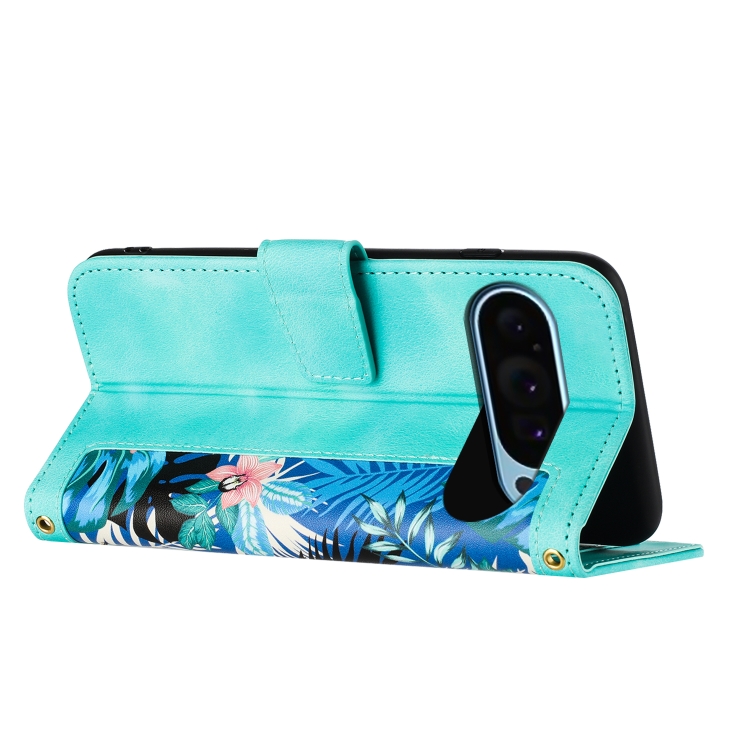 Funda de Cuero con Estampado Floral y Cordón para Google Pixel 9/9 Pro (Verde)