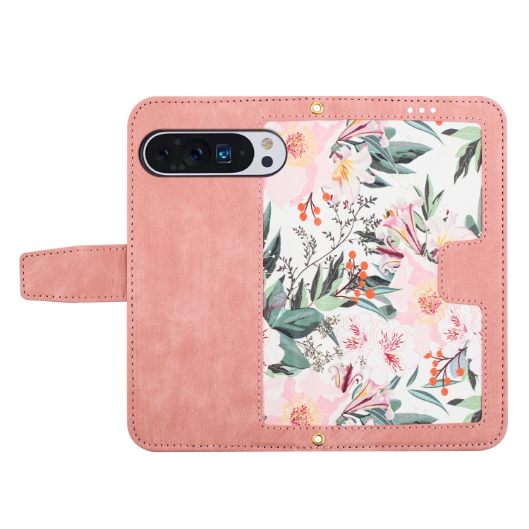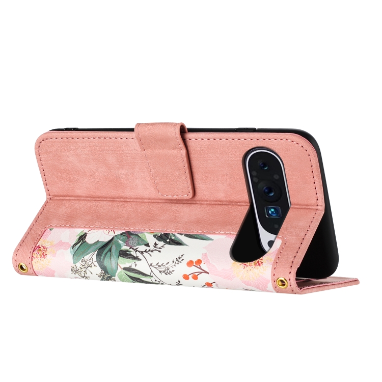 Funda de Cuero con Estampado Floral y Cordón para Google Pixel 9 Pro XL (Rosa)