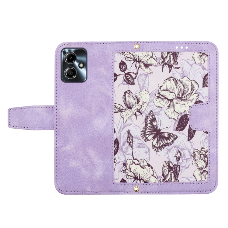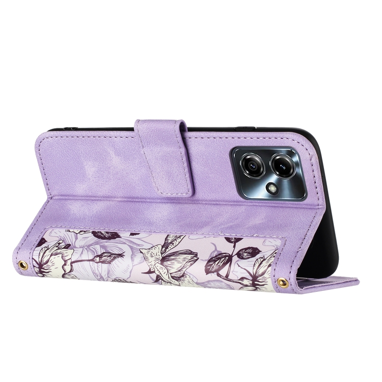 Funda de Cuero con Estampado Floral y Cordón para Motorola Moto G14 (Morado Claro)