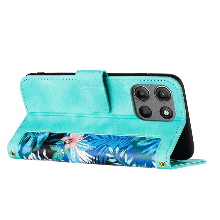 Funda de Cuero con Estampado Floral y Cordón para Motorola Moto G15 (Verde)