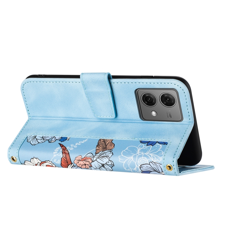 Funda de Cuero para Motorola Moto G84 con Estampado Floral y Cordón (Azul Claro)