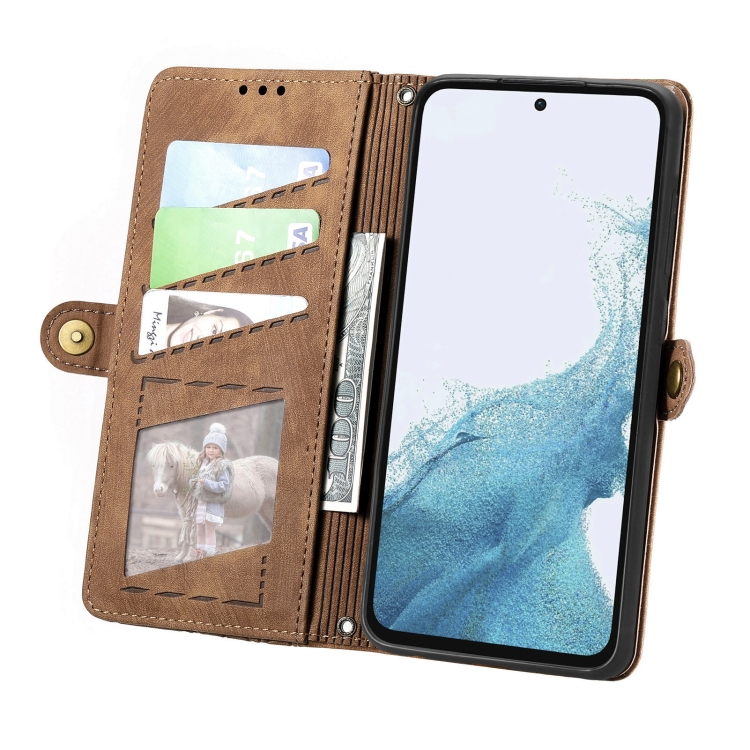 Funda de Cuero Samsung Galaxy A36 5G con Hebilla Lateral y Cremallera Geométrica (Marrón)