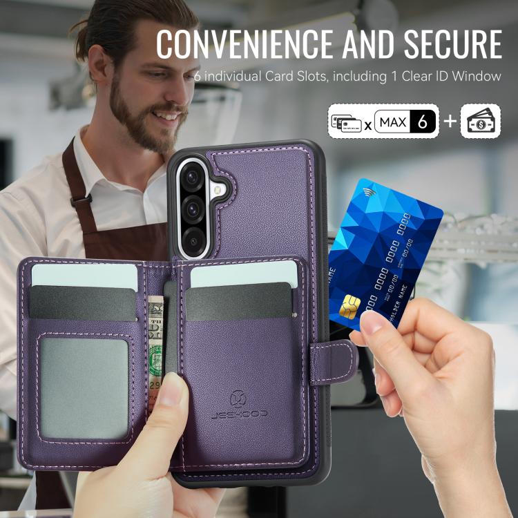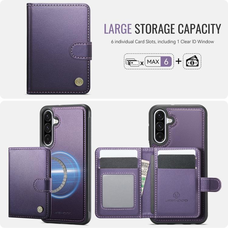 Funda de cuero con hebilla magnética para Samsung Galaxy A56 5G JEEHOOD J09, con ranuras para tarjetas, estilo RFID y MagSafe (morado)