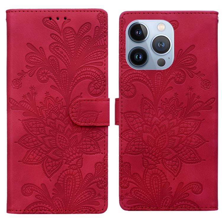Funda de Cuero con Hebilla Magnética y Encaje Floral En Relieve para iPhone 15 Pro Max (Rojo)