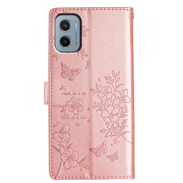 Funda de Cuero para Motorola Moto E15 con Mariposas y Flores (Oro Rosa)