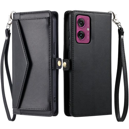 Funda de Cuero para Motorola Moto G55 con Ranura para Tarjetas y Cordón (Negro)