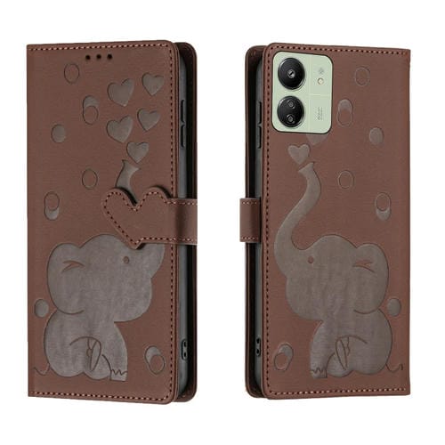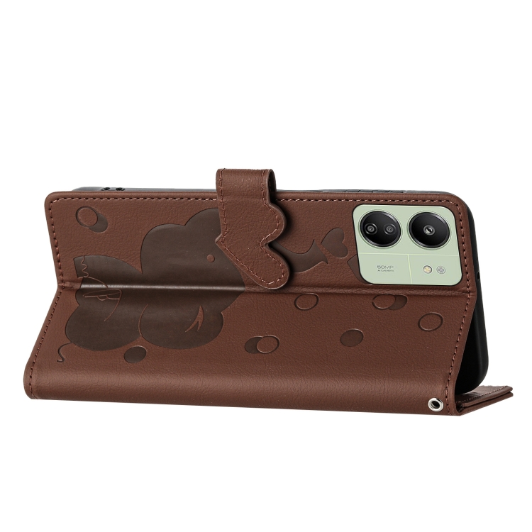 Funda de Cuero con Relieve de Elefante de Dibujos Animados para Redmi 13C 4G (Marrón)