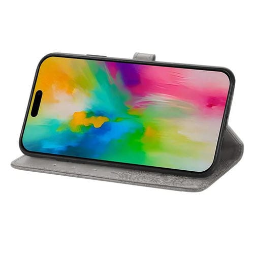 Funda de cuero con relieve de flor de mandala para iPhone 17 (gris)