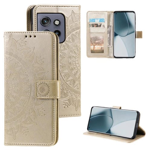 Funda de Cuero con Relieve Flor de Tótem para Motorola Edge 50 Neo con Cordón (Dorado)
