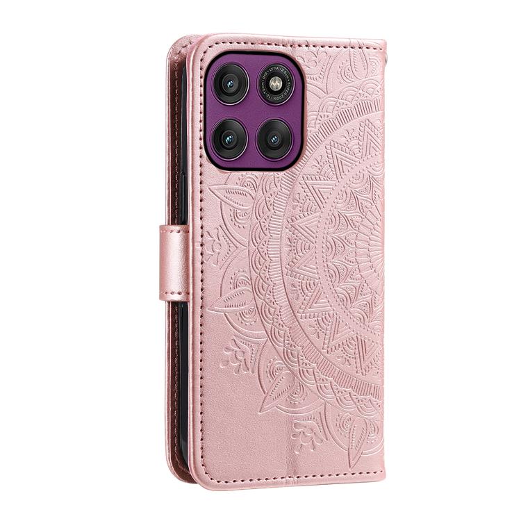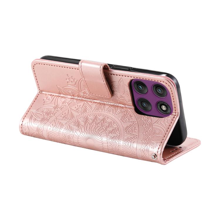 Funda de cuero con relieve de flor tótem y cordón para Motorola Edge 60 Pro (oro rosa)