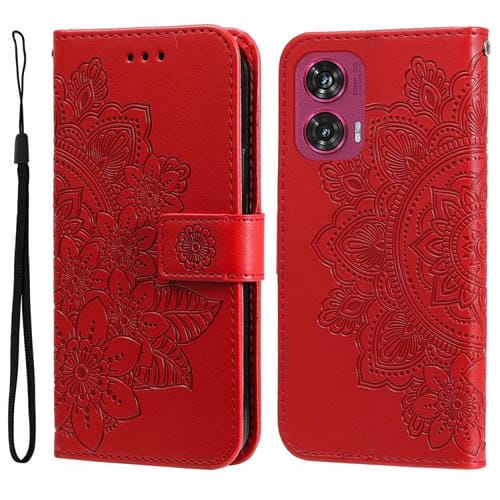 Funda de Cuero con Relieve de Flores de Siete Pétalos para Motorola Edge 50 Fusion (Rojo)