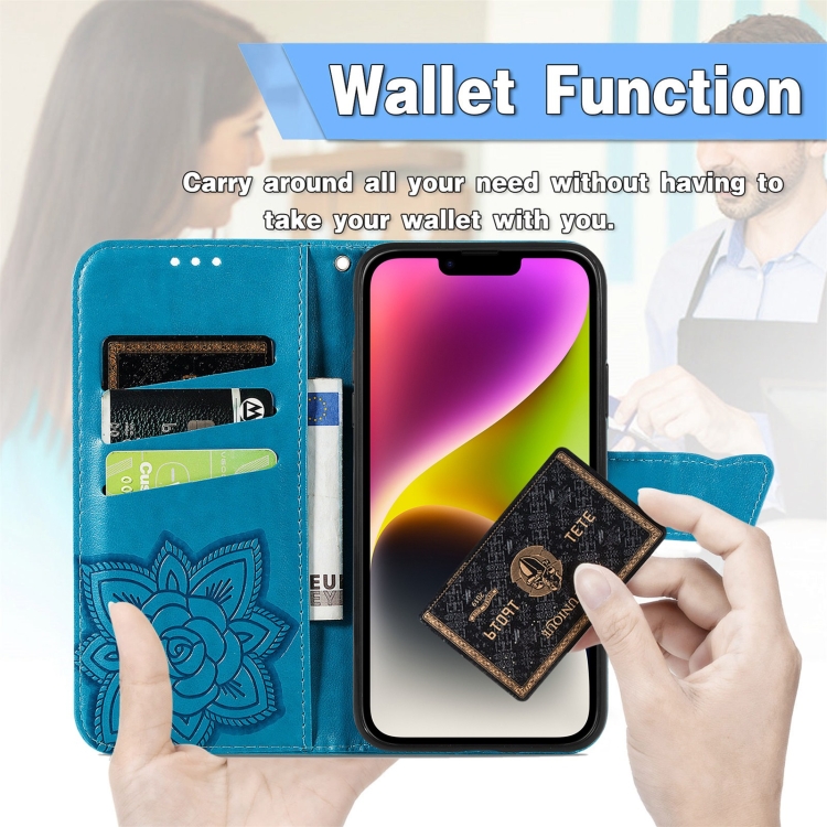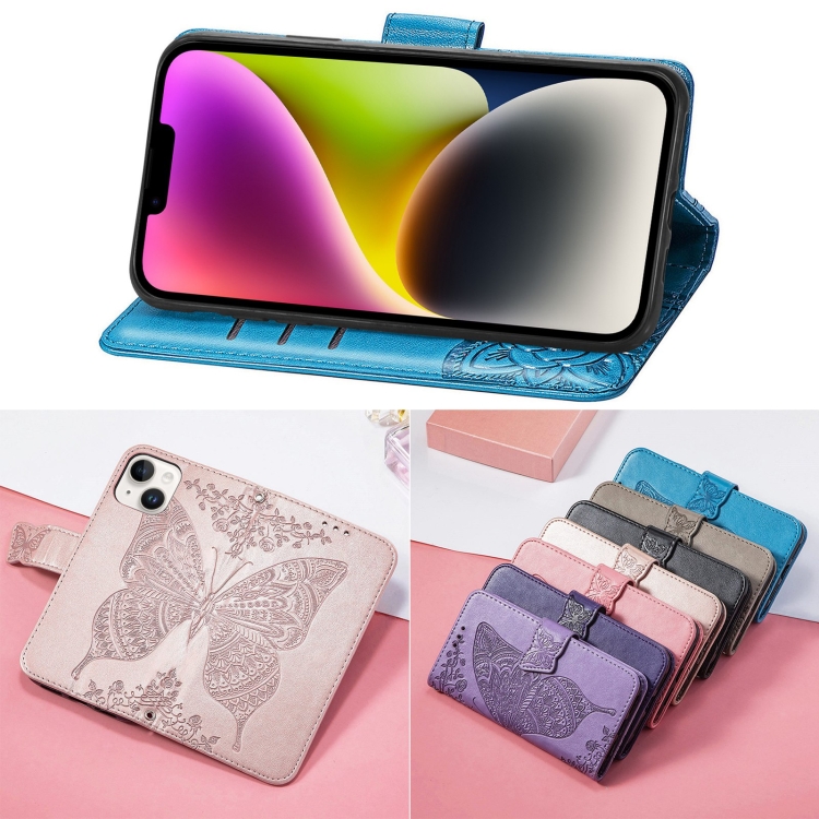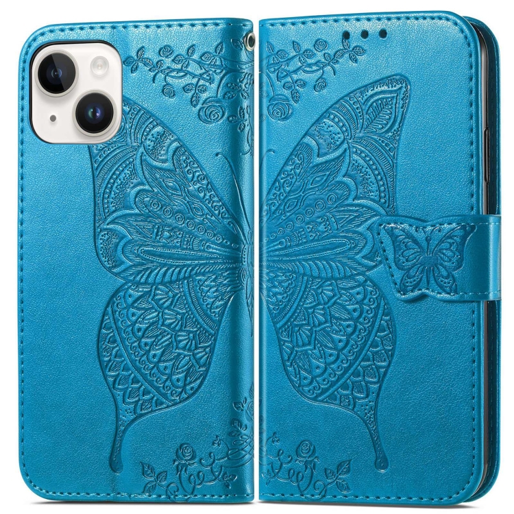 Funda de Cuero con Relieve de Mariposa para iPhone 14 (Azul)