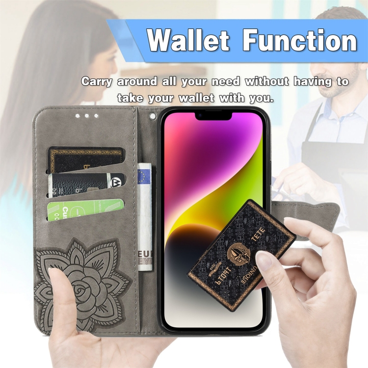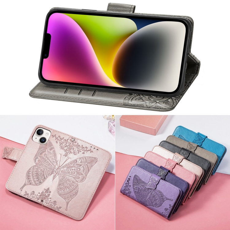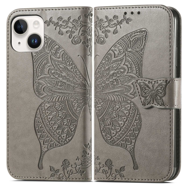 Funda de Cuero para iPhone 14 con Relieve de Mariposa (Gris)