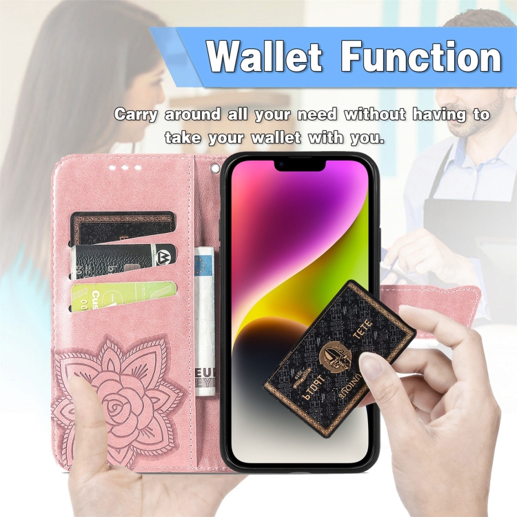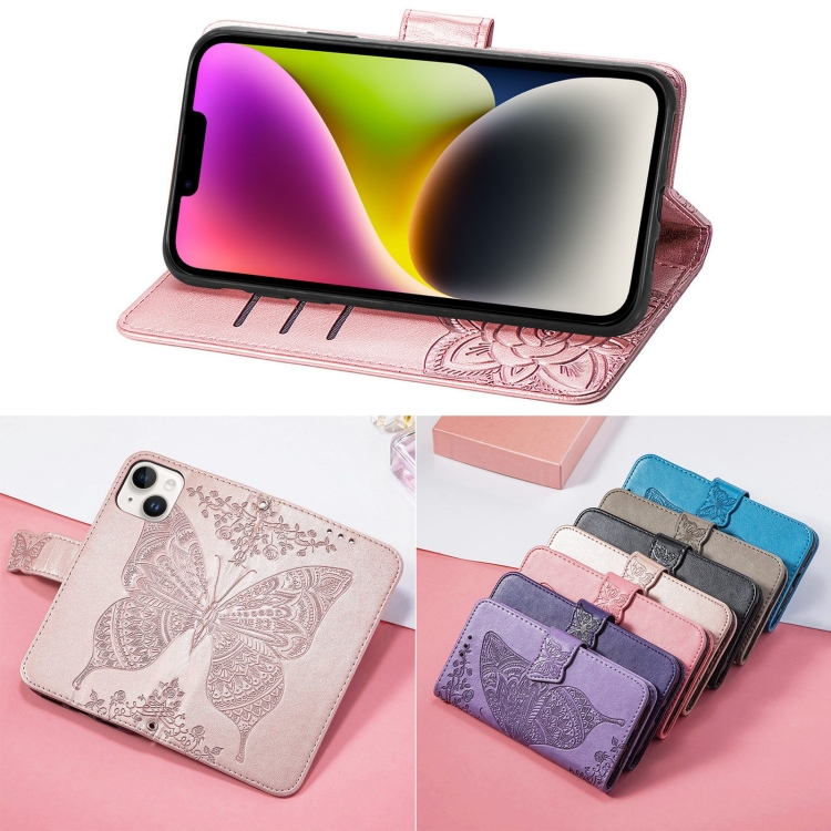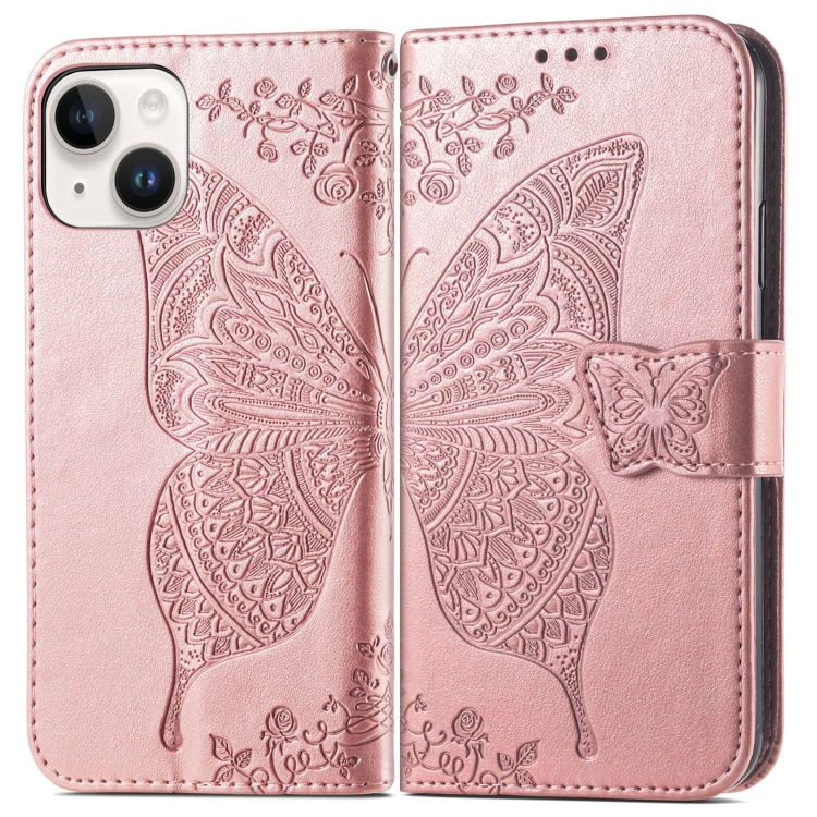Funda de Cuero con Relieve de Mariposa para iPhone 14 (Oro Rosa)