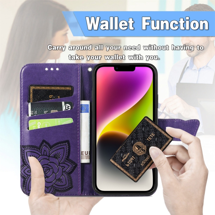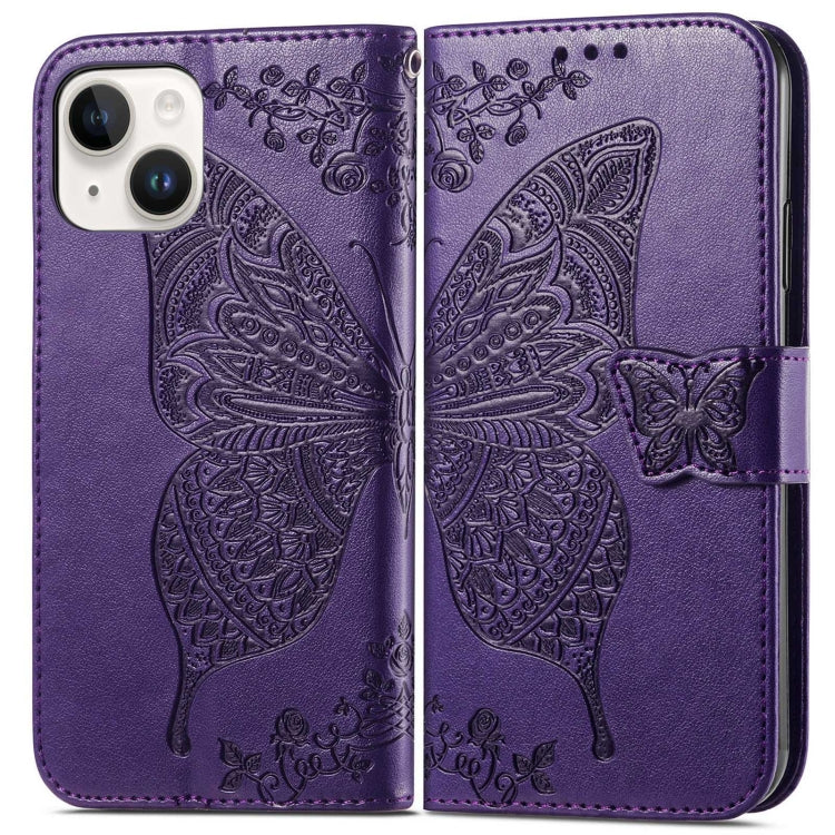 Funda de Cuero iPhone 14 con Relieve de Mariposa (Púrpura Oscuro)